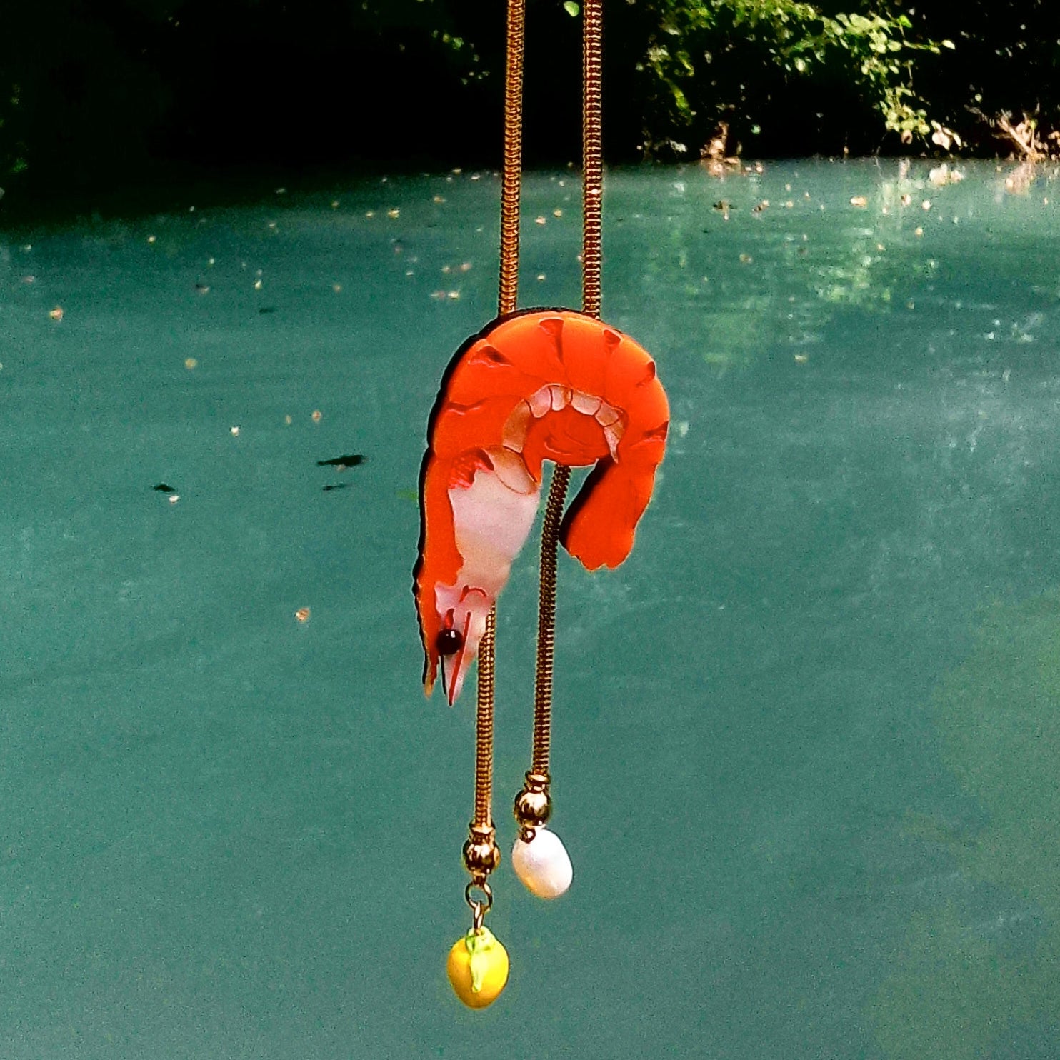 Handmade in our Midwest Studio in colorful hues of orange matte, creamsicle swirl acrylic, and mounted on acrylic. The shrimp slides on a gold-plated snake chain and is adorned with a handmade lampwork glass lemon and pearl.