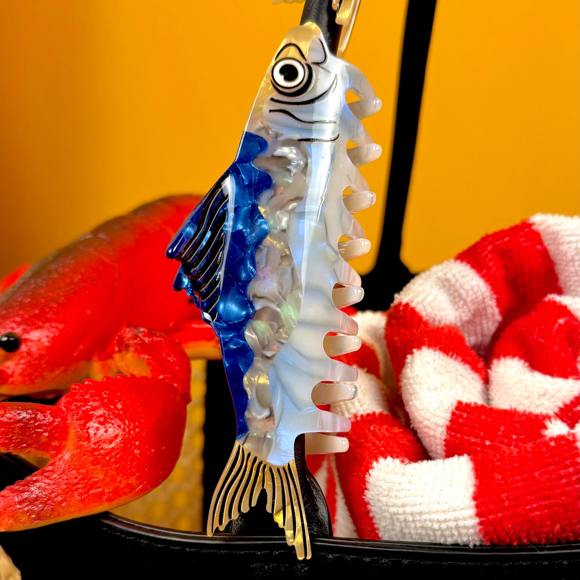 Crafted from glossy, marbled cellulose acetate and finished with sardine details, the Sardine Hair Claw is a vintage-inspired, snack-worthy essential for your top shelf. It’s lightweight yet sturdy, designed to handle buns, twists, and impromptu updos with ease. Styled to evoke retro tinned fish packaging, it’s a playful nod to pantry staples — and a must-have for your accessories rotation.